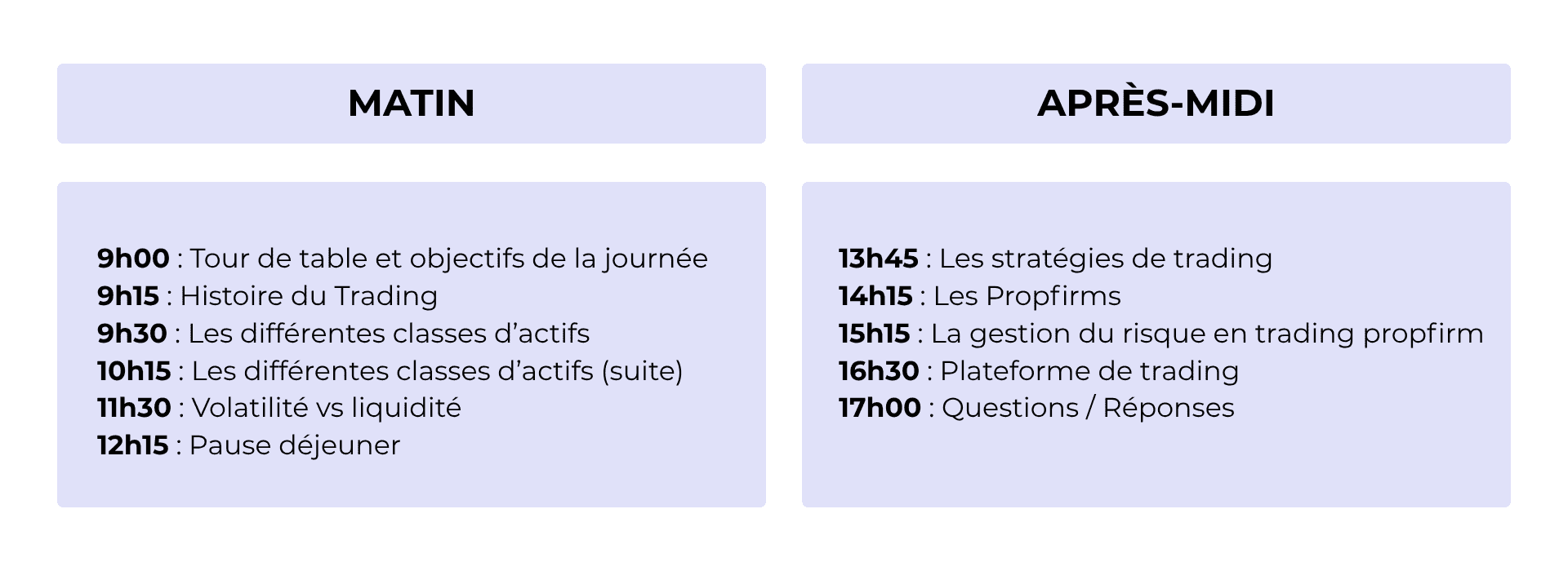 Une journée intensive pour maîtriser les bases de la gestion de portefeuille, analyser les risques et découvrir les stratégies de swing trading et de scalping grâce au modèle propfirm.